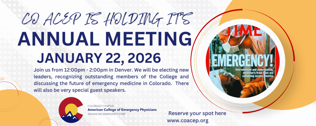 WHEN: DATE: January 22, 2026TIME: 12:00 pm – 2:00 pm LOCATION: To be announced when finalized CO ACEP Annual Meeting Registration CO ACEP Annual Meeting Registration Register today for the 2026 CO ACEP Annual Meeting. Name * First Last Name * Last Email Address * Enter Email Confirm Email Address * Confirm Email Address Address Address Address City City State/Province AlabamaAlaskaArkansasArizonaCaliforniaColoradoConnecticutDelawareDistrict of ColumbiaFloridaGeorgiaHawaiiIdahoIllinoisIndianaIowaKansasKentuckyLouisianaMaineMarylandMassachusettsMichiganMinnesotaMississippiMissouriMontanaNebraskaNevadaNew HampshireNew JerseyNew MexicoNew YorkNorth CarolinaNorth DakotaOhioOklahomaOregonPennsylvaniaRhode IslandSouth CarolinaSouth DakotaTennesseeTexasUtahVermontVirginiaWashingtonWest VirginiaWisconsinWyoming State/Province Zip/Postal Zip/Postal Register If you are human, leave this field blank.